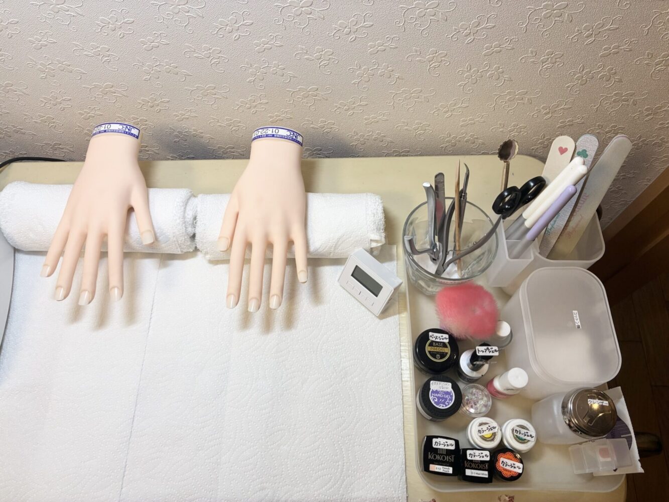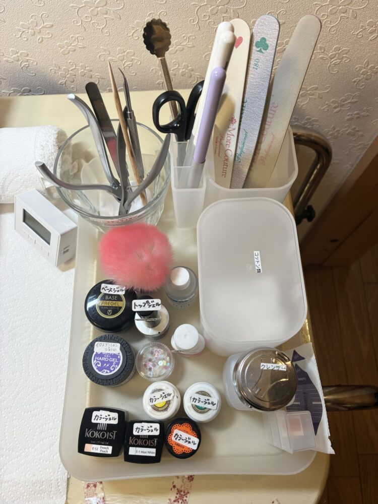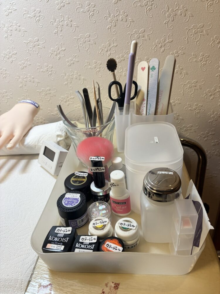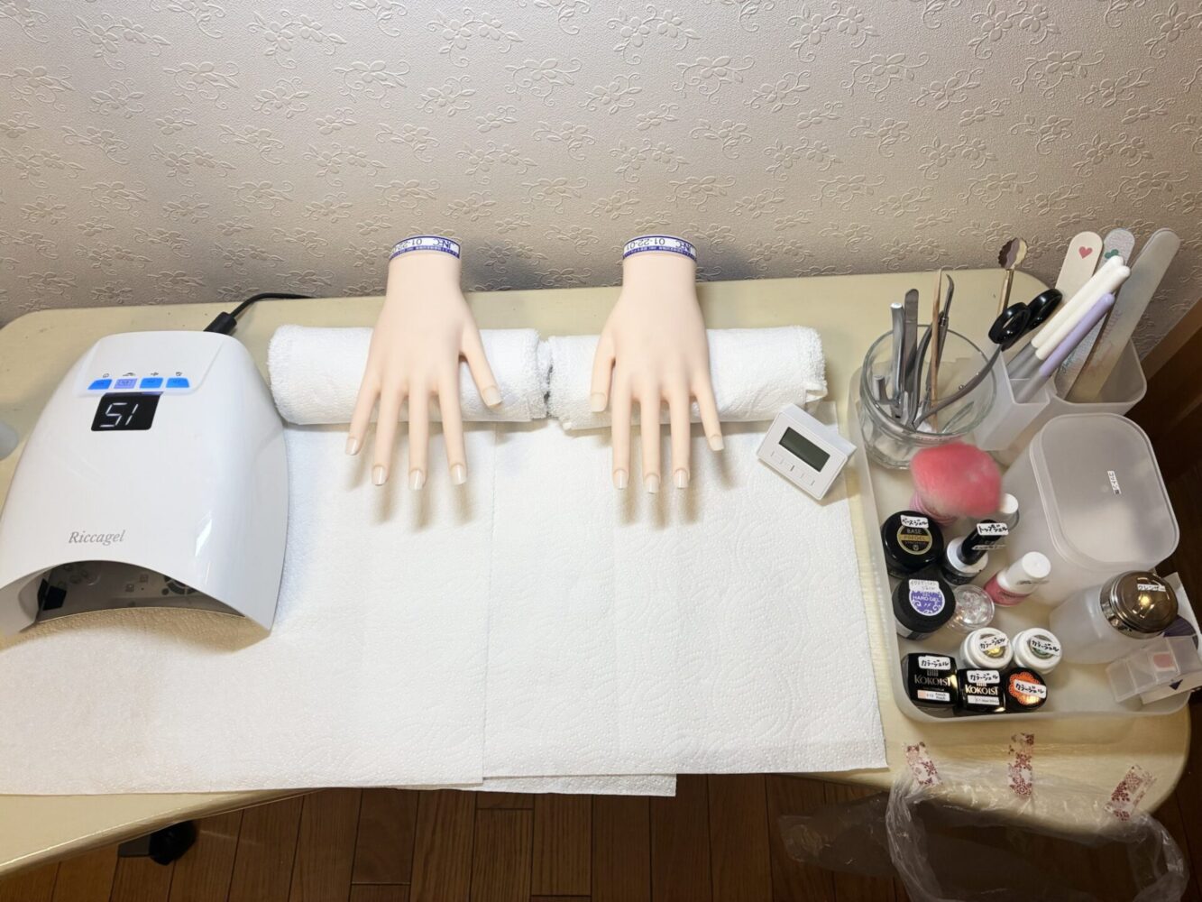 中級でも話したけど、ジェルスカのフォーム潰れを防止するために手に持って硬化させるので、ライトは斜めに底上げしています。